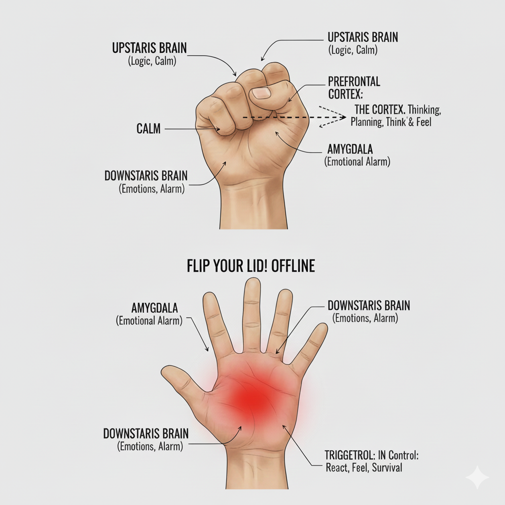 Your Fingers (Folded Over): This is your Thinking Brain—logic, empathy, problem-solving, wisdom.
